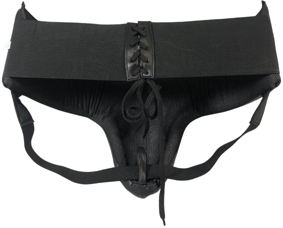 Men's jockstrap with a strong plastic insert covered with eco-leather. The jockstrap is anatomically contoured, which, combined with wide elastic and a tie at the back, allows for a perfect fit.