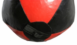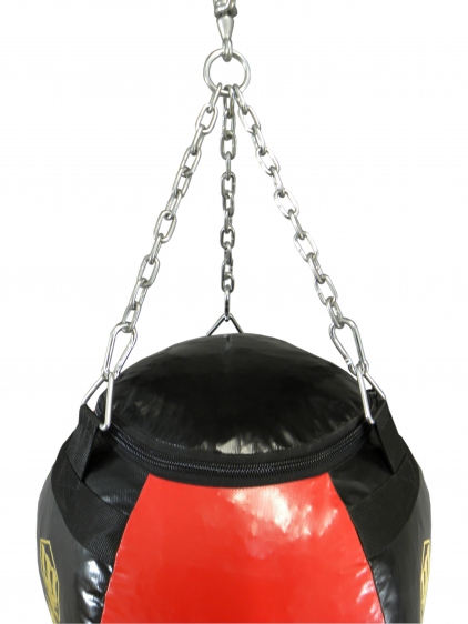 SPOSÓB ZAWIESZENIA: zawieszany jest za pomocą 3 łańcuchów połączonych karabińczykami z trójkątnymi uchwytami przyszytymi do gruszki. Przeszycia są dodatkowo zabezpieczone nylonowymi taśmami wszytymi prostopadle do uchwytów. Łańcuchy połączone są oczkiem do którego przymocowany jest krętlik (okrętka). Możliwośc wymiany łańcuchów dzięki zastosowaniu karabińczyków.